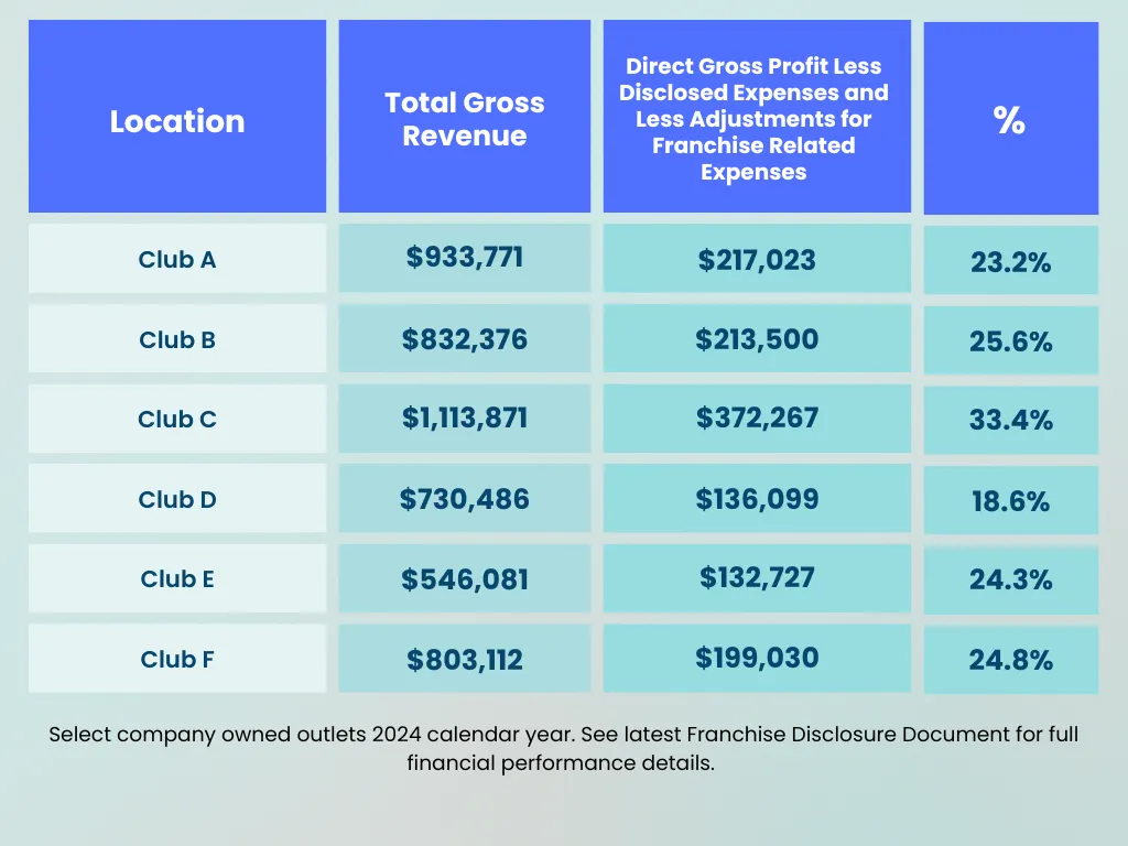 1. See Fitness Premier 2025 Franchise Disclosure Document for full details. Some locations have reached these levels. There is no guarantee you will achieve these same or similar levels. This advertisement does not constitute a franchise offering. Franchise offerings are made by Franchise Disclosure Document only.